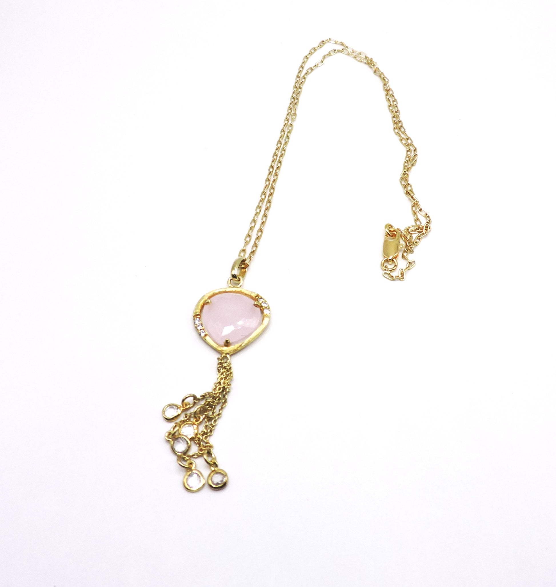 "Delicate gold-plated 925 silver necklace, adorned with shimmering zircons and pink quartz accents."
