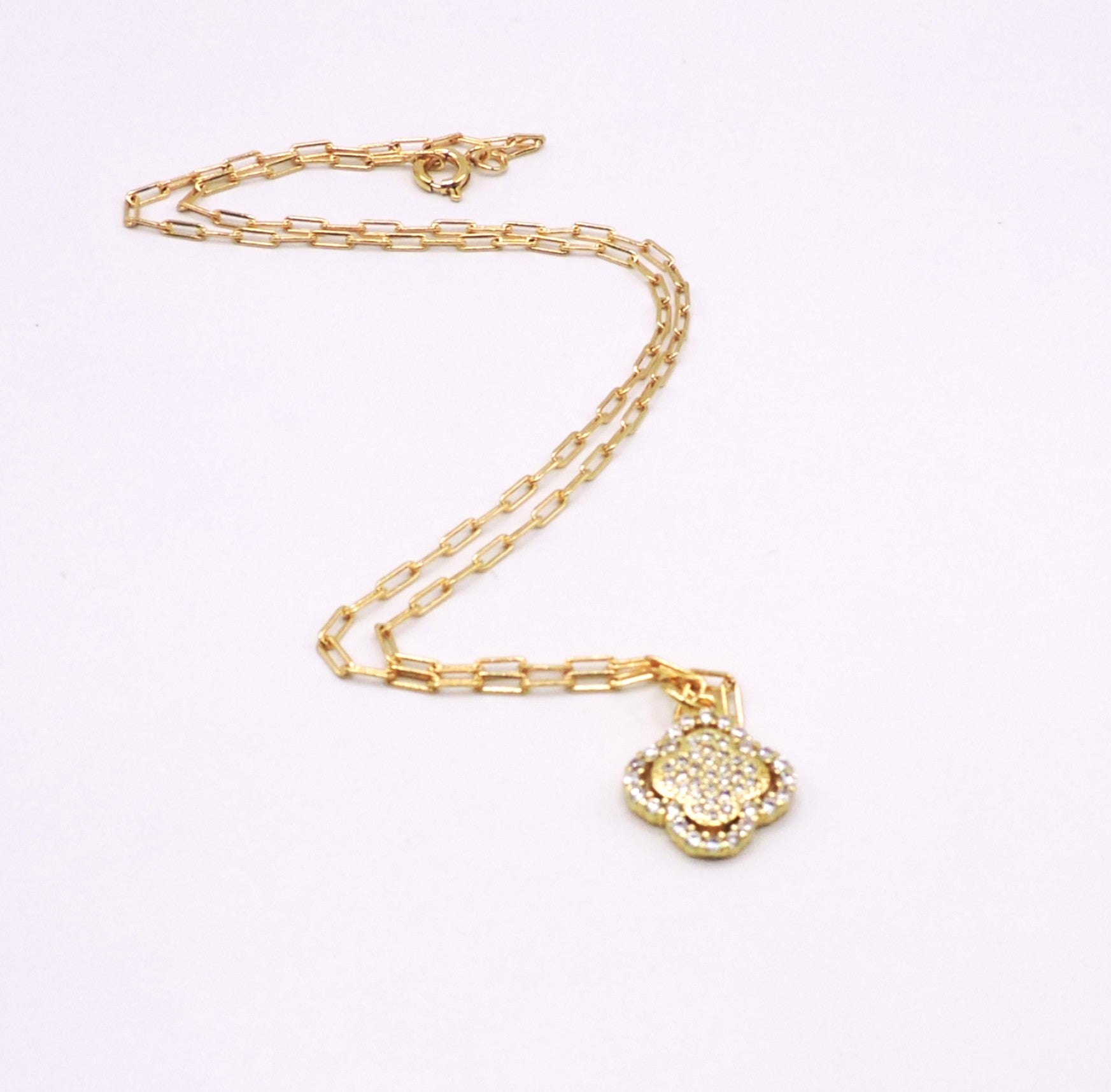 A delicate and symbolic jewelry piece, this chain features dainty clover motifs embellished with micropave-set stones, adding subtle sparkle. Crafted in gold-filled material, it combines durability with a luxurious finish. The clover symbolizes luck.