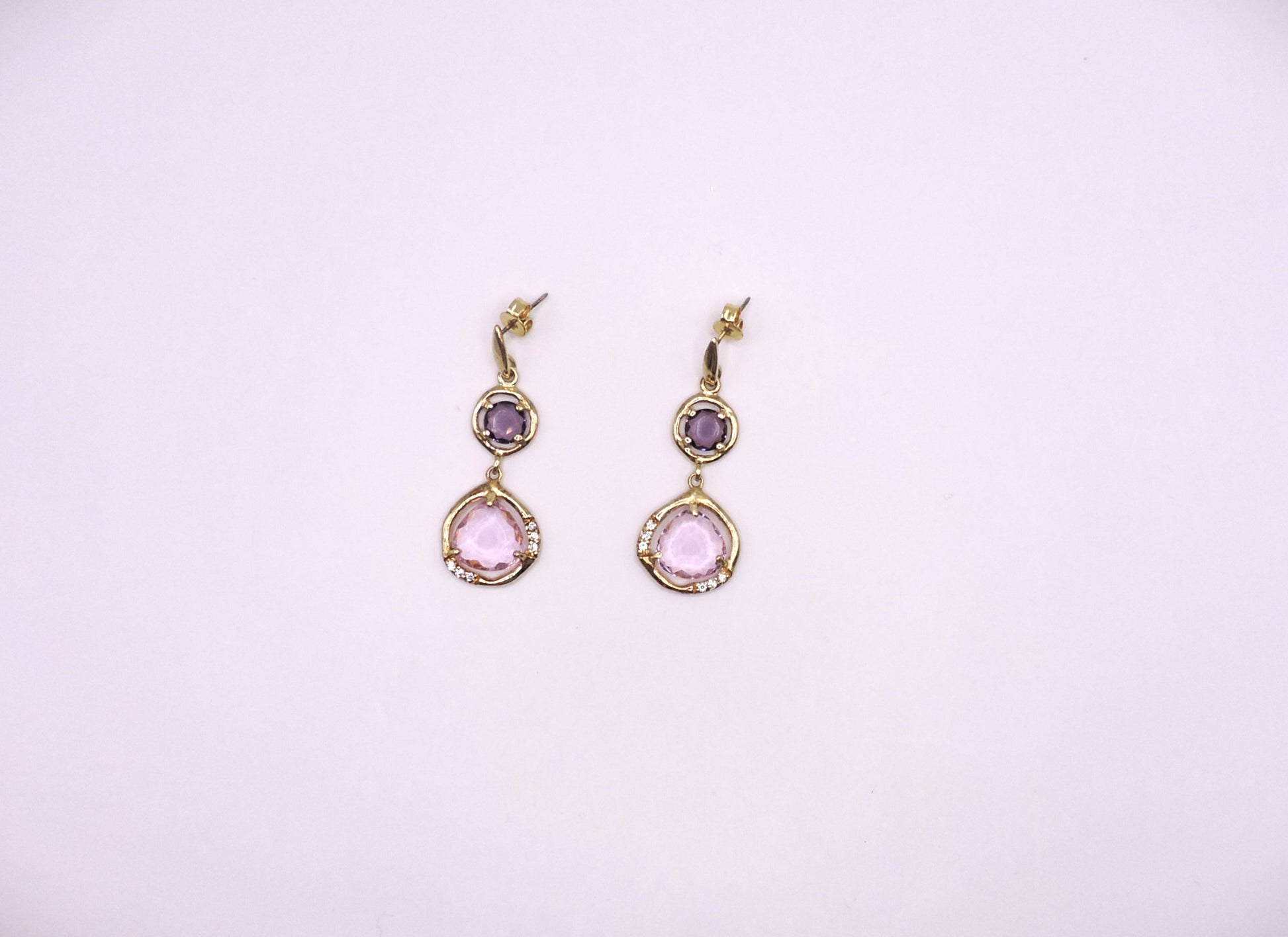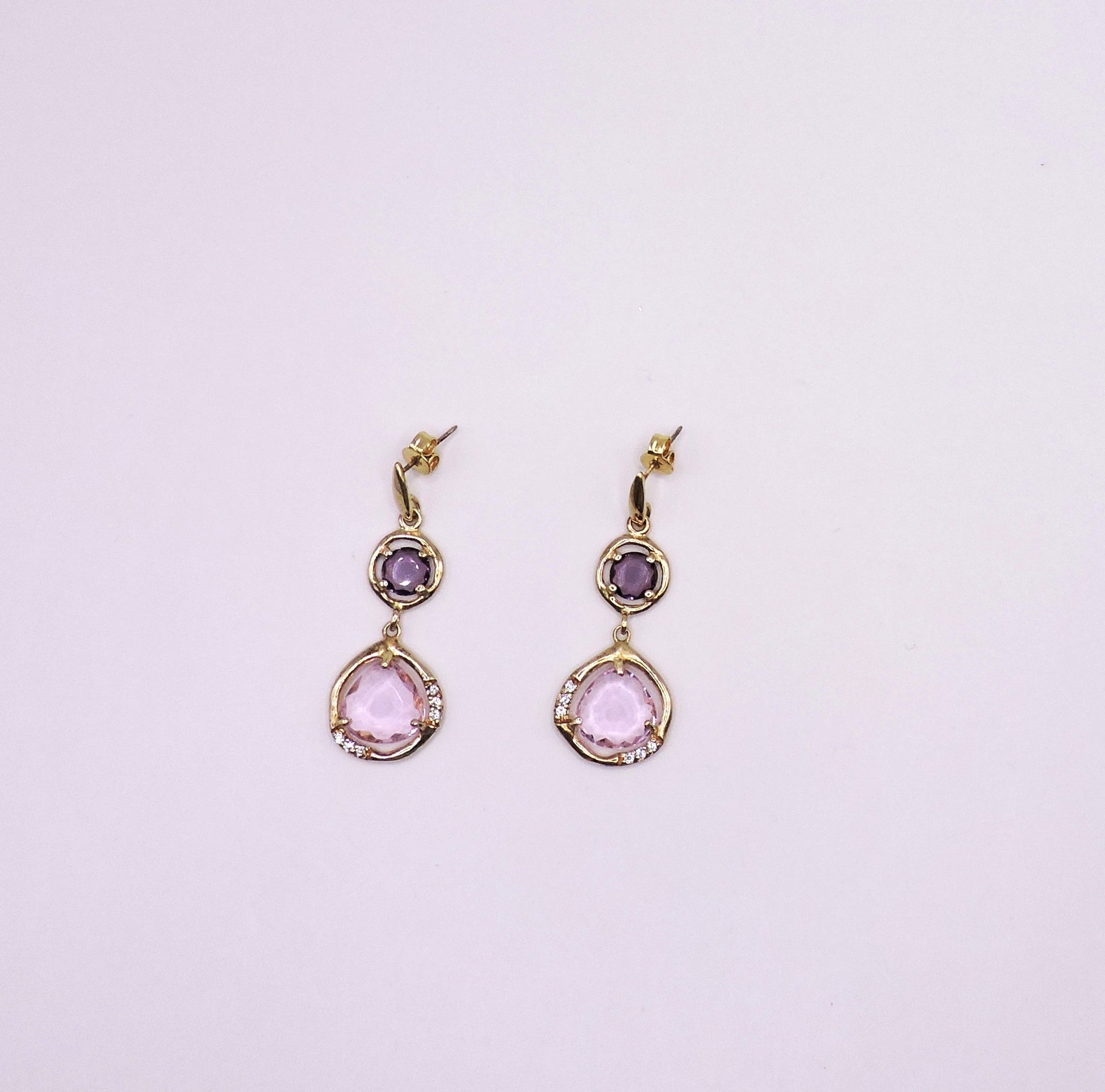 "Elegant gold-plated silver earrings with shimmering zircons and soft pink semiprecious stones."