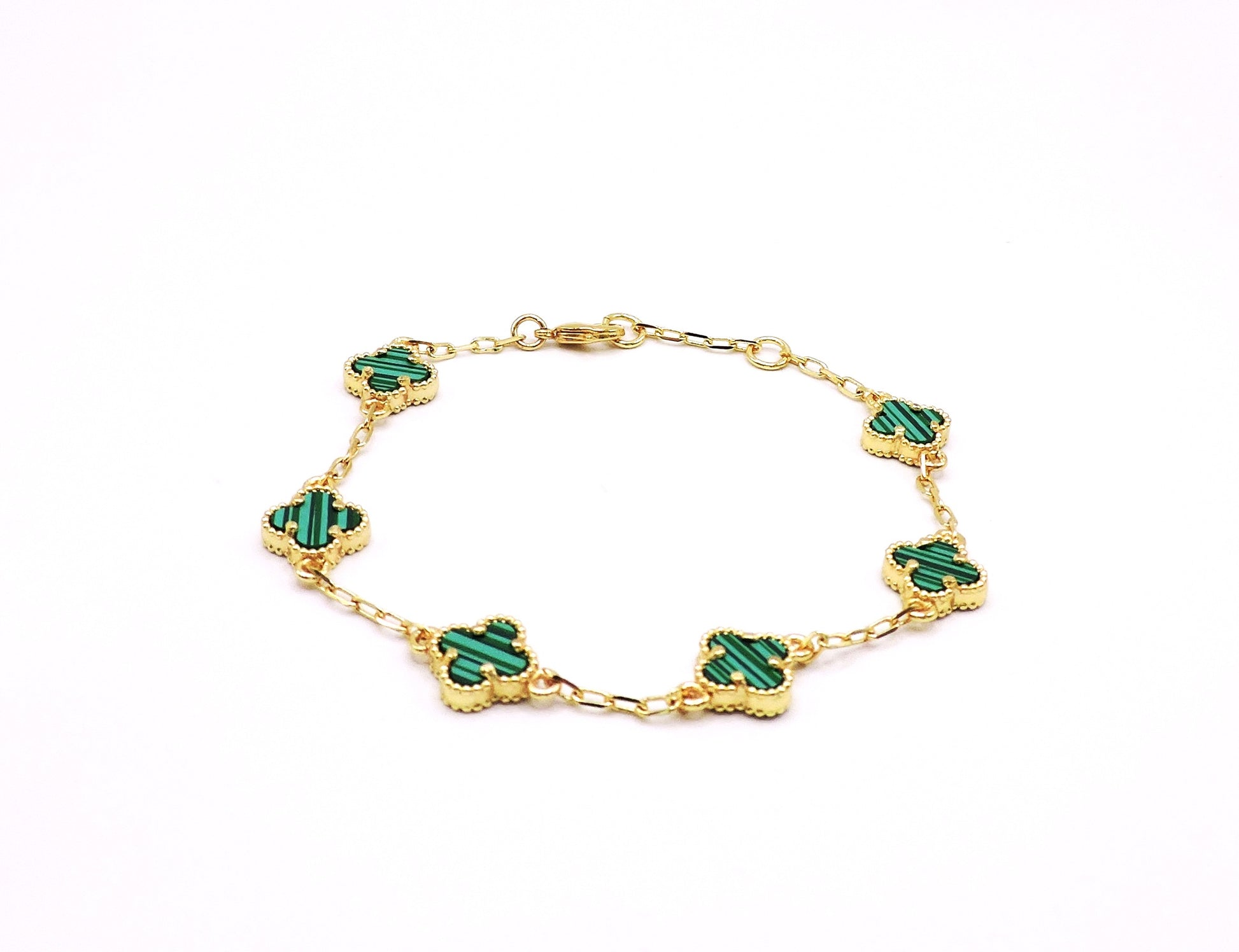 A delicate gold-filled chain bracelet featuring a petite green clover charm, symbolizing luck and positivity. Lightweight, tarnish-resistant, and subtly whimsical—perfect for everyday wear or as a meaningful gift.