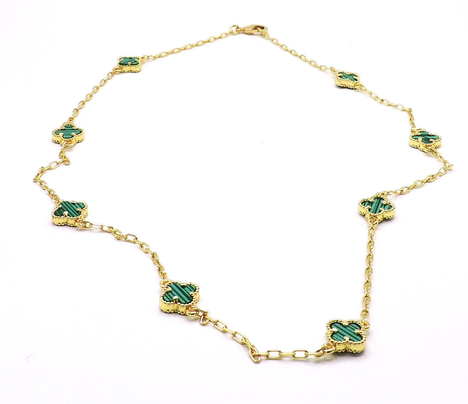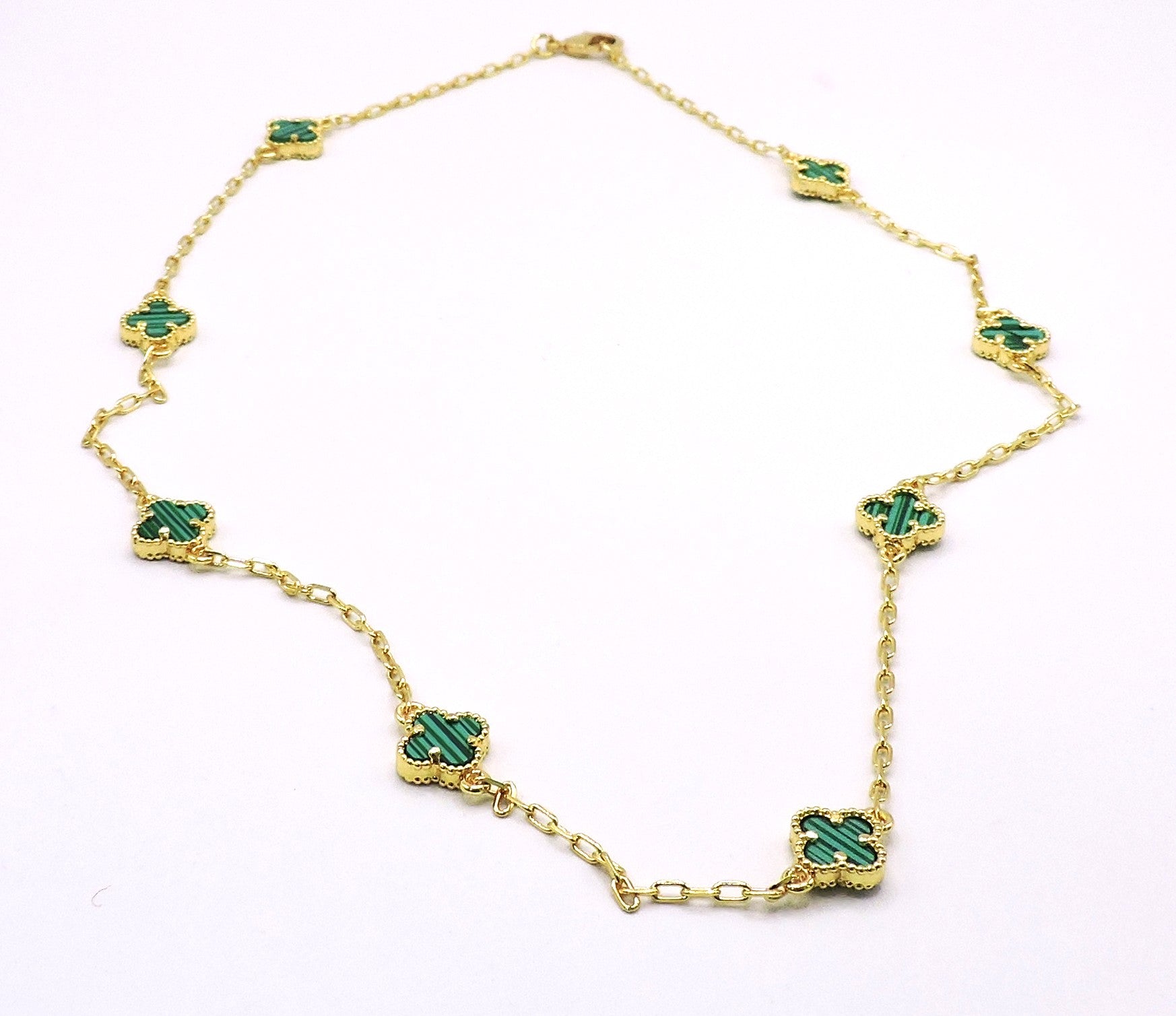 A delicate gold-filled pendant featuring a four-leaf clover design with vibrant green crystals or enamel accents, symbolizing luck and prosperity. Crafted for lasting shine, it combines timeless symbolism with