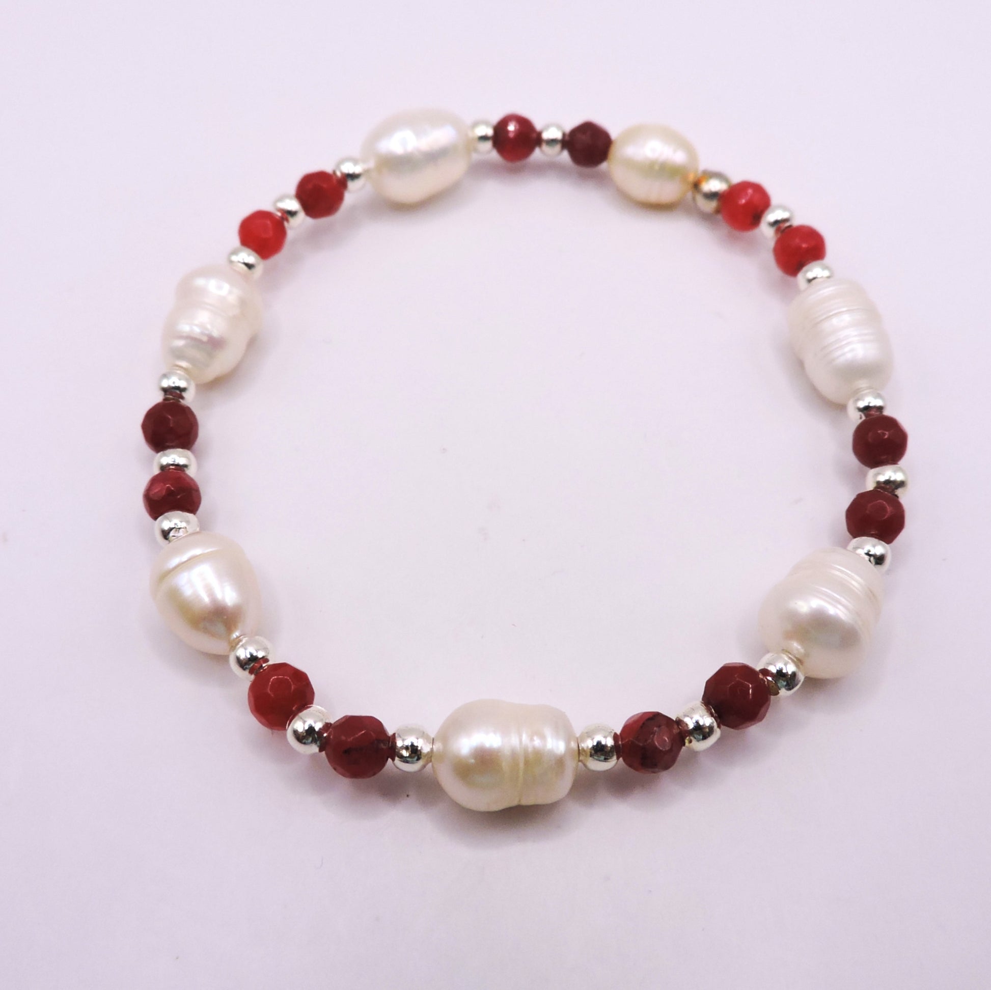River pearl bracelet accented with genuine red stones, combining natural elegance with a bold touch of color.