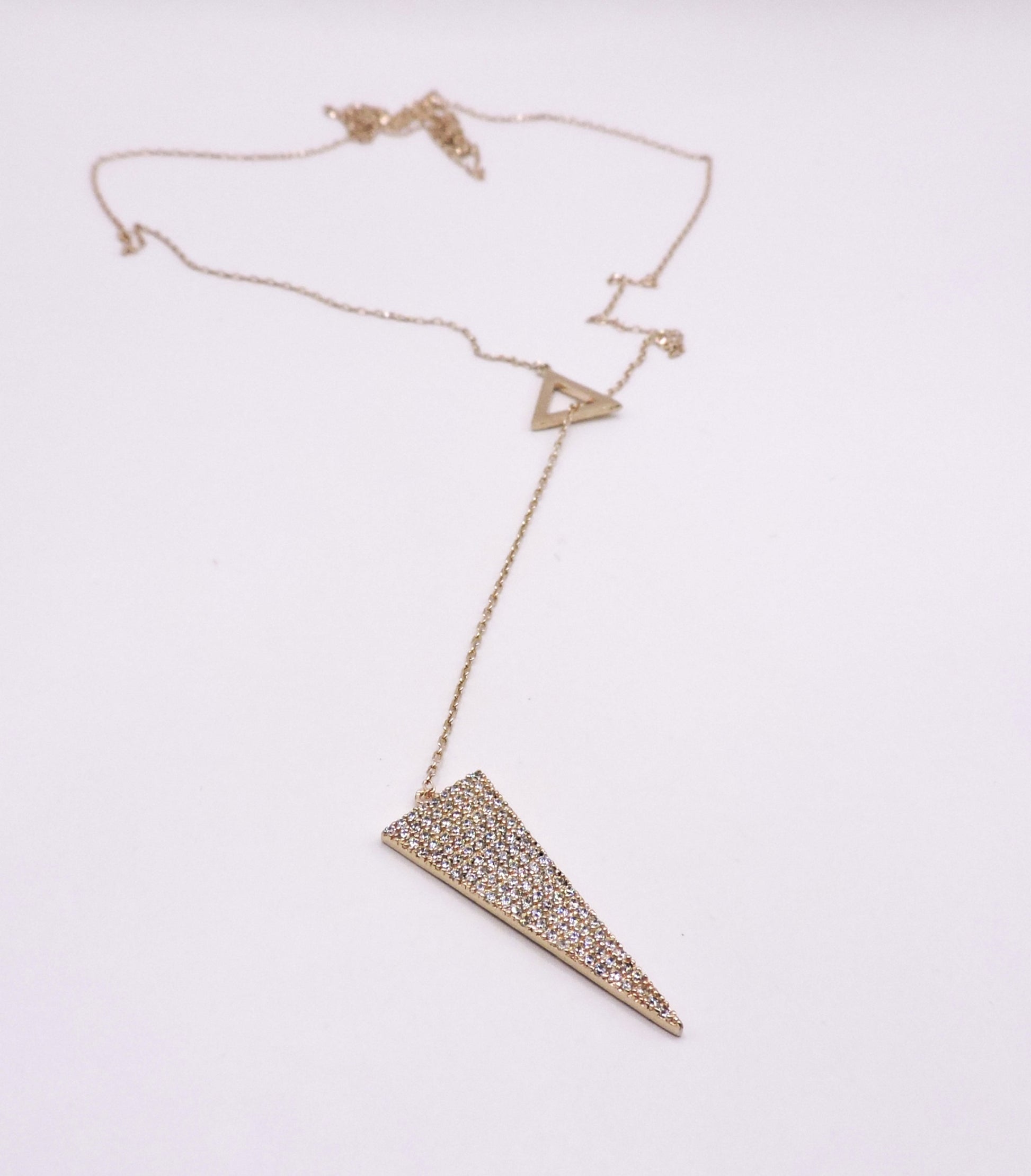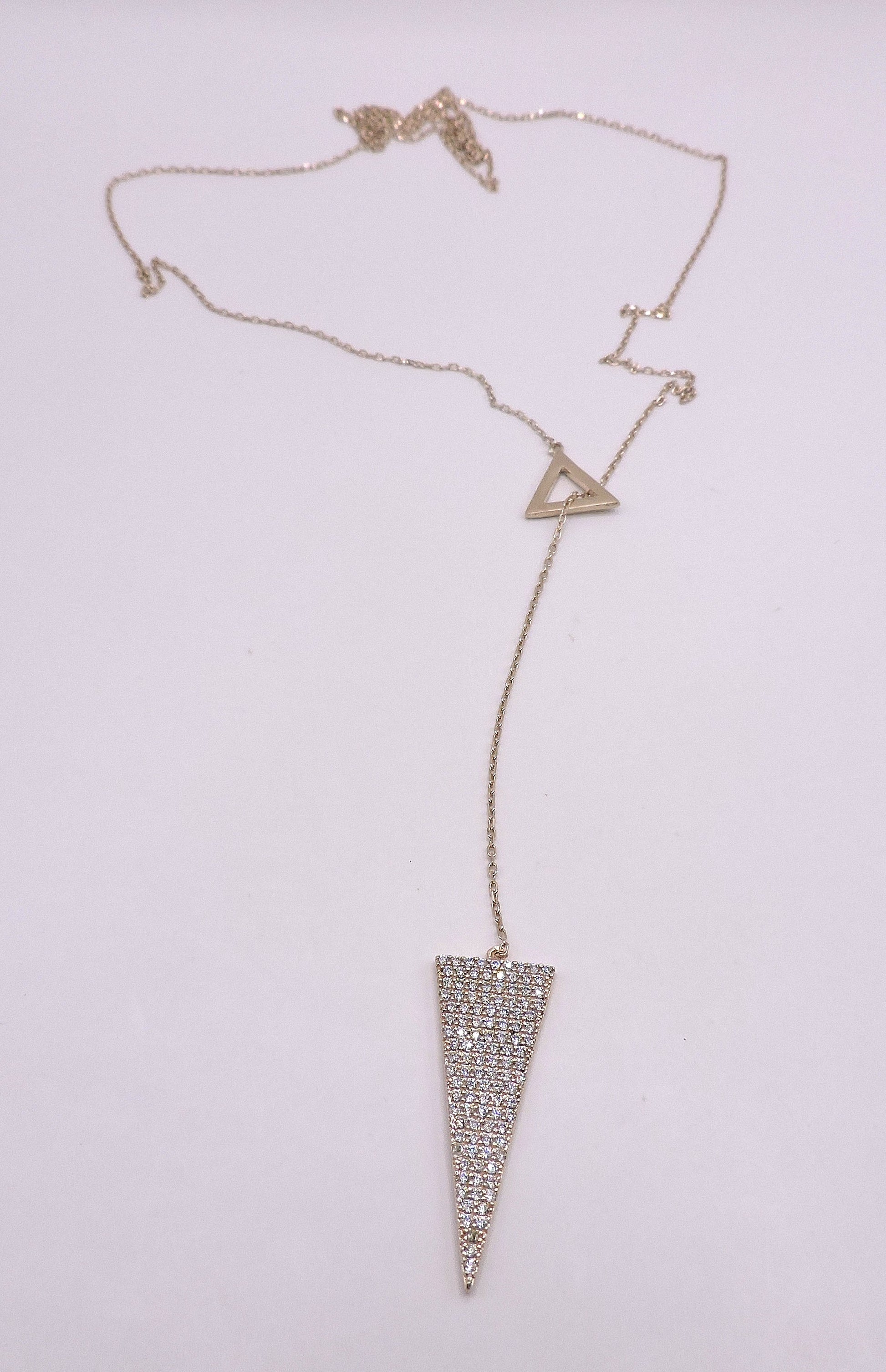 Rose gold silver necklace in the shape of an arrowhead, passed through a triangle.